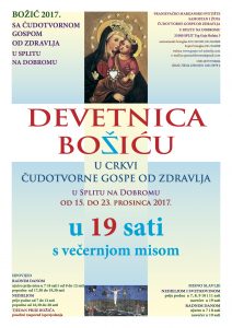 U svetištu Čudotvorne Gospe od Zdravlja u Splitu na Dobromu, od petka, 15. do subote, 23. prosinca 2017. molimo pjevanu Devetnicu Božiću za vrijeme večernje mise u 19 sati: himan, psalmodija, Zborna molitva, prvi misno čitanje, pripjevni psalam, aleluja, evanđelje, prigodna homilija, Vjernička molitva, Euharistijska služba, Euharistijska molitva, obred pričesti, antifone za Veliča, himan Veliča, završni misni blagoslov, uz prigodne adventske, marijanske i euharistijske pjesme.
